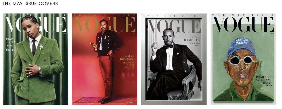 American Vogue’s latest MET issue covers are here, featuring this year’s MET Gala co-chairs, Pharrell Williams, A$AP Rocky, Colman Domingo, and Lewis Hamilton. The spread also covers and celebrates black artists/models and black designers, highlighting this year’s theme- “Superfine: Tailoring Black Style,” honouring the museum's exhibition, which will highlight the archetype of the Black dandy.