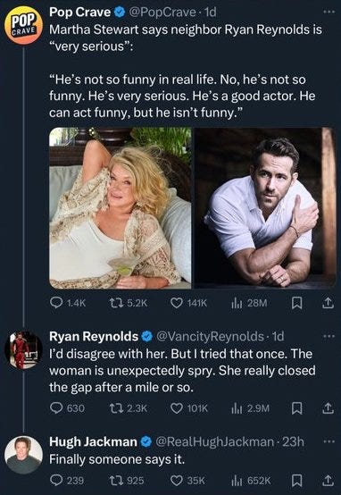 In a recent interview, Martha Stewart called Ryan Reynolds “not funny”, Ryan and Hugh Grant responded on Twitter.