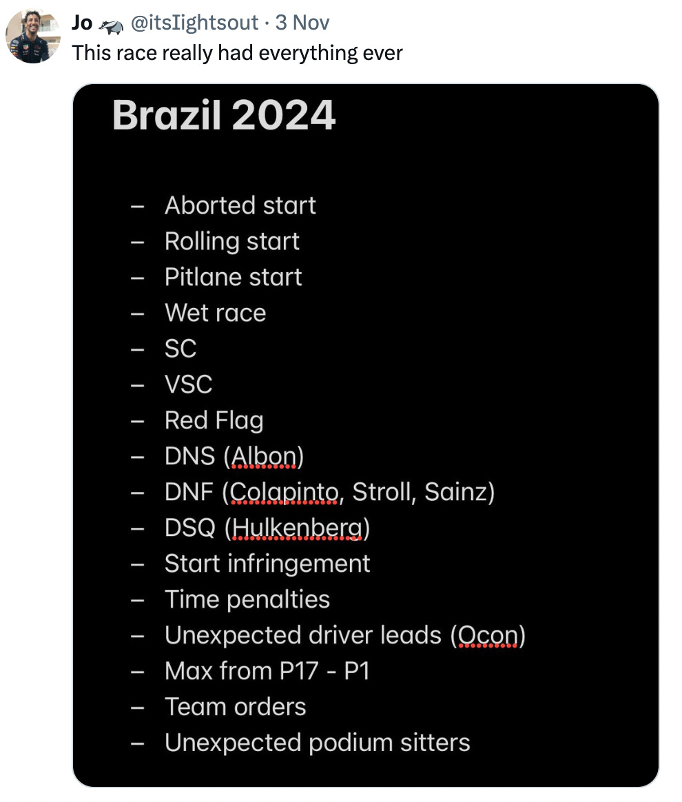 The 2024 Formula 1 Brazil Grand Prix was action-packed to say the least. The wet conditions rendered a level playing field leading to Max Verstappen winning after a 10-race dry spell and the underdogs, Alpine, making it to the podium with both their drivers!