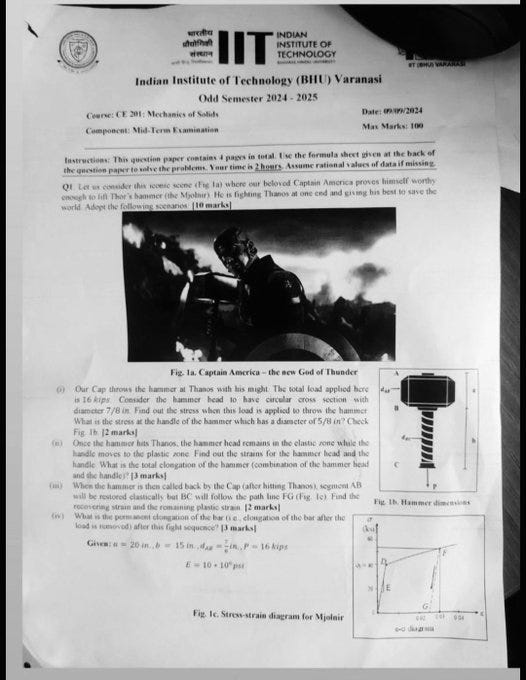 The Captain America yielding the Mjolnir vs Thanos scene from Avengers Endgame was referenced in an exam question at IIT Varanasi.