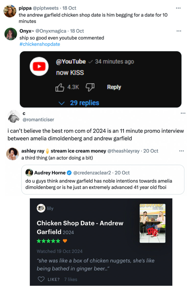 The internet is collectively obsessed with Andrew Garfield’s interview with Amelia Dimoldenberg on her YouTube series Chicken Shop Date. The chemistry is off the charts as Andrew kept deflecting Amelia’s usual attempts to joke with and rizz up her guests, and took charge of the interview with earnestness seemingly actually wanting to date her minus the cameras! Very Fleabag-hot-priest-coded of him tbh.