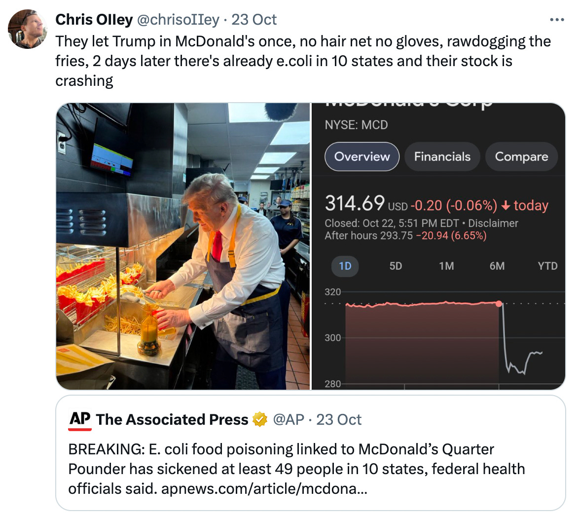 Donald Trump tried to have a photo op working in a closed McDonald’s. In other news, and E.coli outbreak is being traced back to the McDonald’s Quarter Pounder in America.