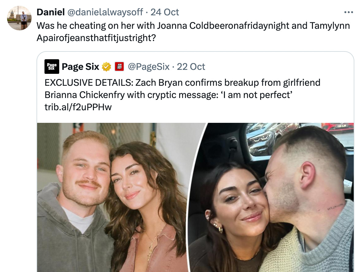 Singer Zach Bryan confirmed his break-up with girlfriend Brianna Chickenfry. FYI: Sadly, that is not her real last name. Born Brianna Lapaglia, she changed her name after a vine went viral where she compared her legs to chicken fries…