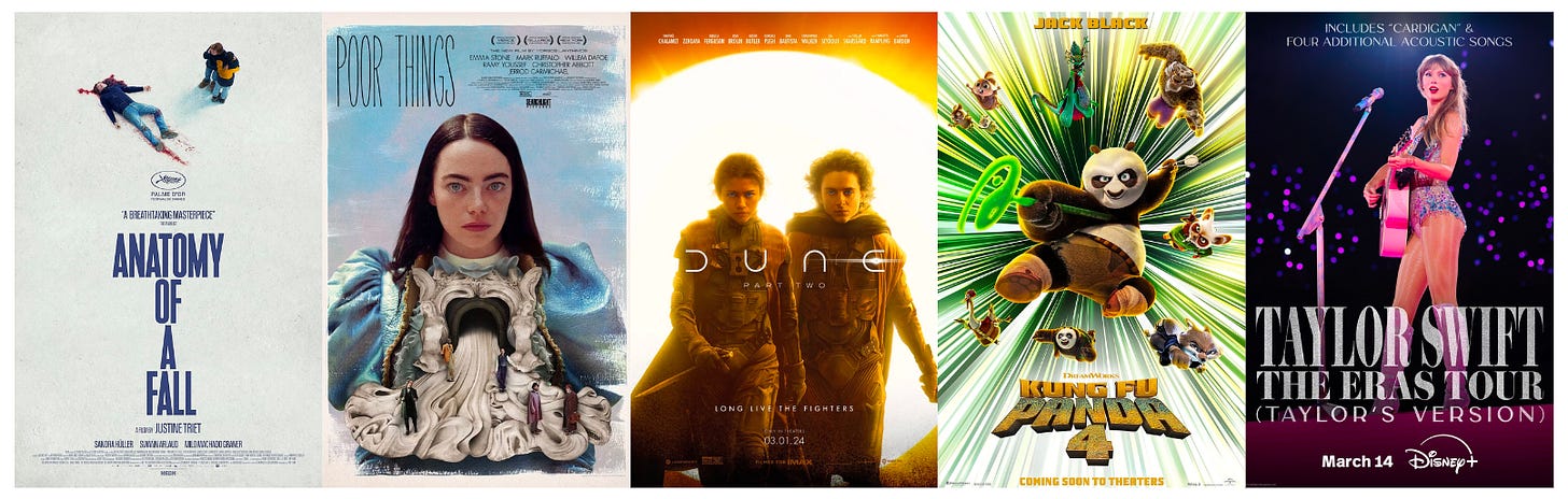 With the Oscars taking place last weekend, itâs time to catch up on some Best Picture nominees that werenât Barbie or Oppenheimer. If youâre looking for a procedural drama with deep characterization and raw human emotions at the forefront, Anatomy of a Fall is your pick. Now, with Emma Stone winning Best Actress for her performance in Poor Things, I was quite excited to watch the quirky-looking adaptation. Letâs just say, that apart from deep meanings and a social commentary subtext, it may not be everyoneâs cup of tea. Certainly wasnât mine. Moving on to the much-awaited part two of Denis Villeneuveâs Dune, itâs a visual delight and a top-notch movie-going experience. With stunning vistas, haunting scores and commanding performances by Timothee Chalament, Zendaya, Rebecca Ferguson and Austin Butler, it lives up to the hype created by the first instalment of the franchise. Watch it in IMAX if you can and feel the sandworm scenes rumble the floor like a 4D screening. And well, if the serious, artsy or sci-fi type is not your type, have unabashed fun with Po in the newest Kung Fu Panda voiced by the enigmatic Jack Black. Also, you can now catch the most talked about and highest-grossing tour of all time at your home as Taylor Swiftâs The Eras Tour concert film is now available to stream on Disney Plus. With extra songs including Cardigan and The Archer (cut from the theatrical release of the movie) and four additional songs in the acoustic set, Taylorâs 3-hour performance is a must-watch whether youâre a Swiftie or not!