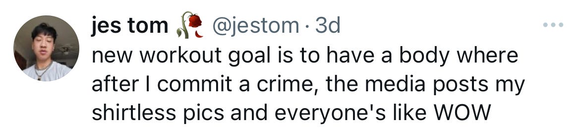 Apparently radicalised by a back surgery (validated by the numerous chronic back pain books logged onto his Goodreads account, alongside The Lorax), the computer science major was valedictorian of his high school, attended an Indian wedding, replenished food he ate from his dorm’s communal kitchen, played the deadly game of Among Us, and had contrarian political beliefs. Netizens were also quick to uncover his family history (he’s richer than the CEO he killed), his birth chart (Taurus Sun) and sexual orientation (bi), amongst other details (he’s a nerd). And of course, the numerous, objectively hot, shirtless pictures.