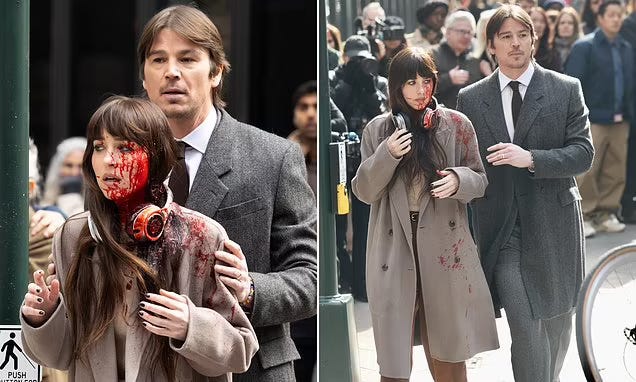 New set photos from the adaptation of Colleen Hoover’s Verity sees a bloody Dakota Johnson and Josh Hartnett.