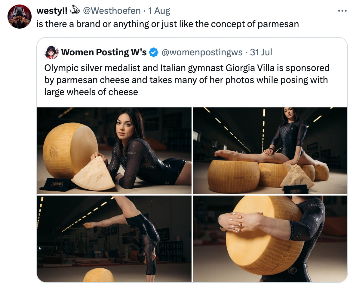 Italian gymnast, Giorgia Villa is sponsored by… Parmesan. The Internet discovered that the silver medalist is sponsored by Parmigiano-Reggiano and regularly posts pictures of herself with big wheels of cheese!