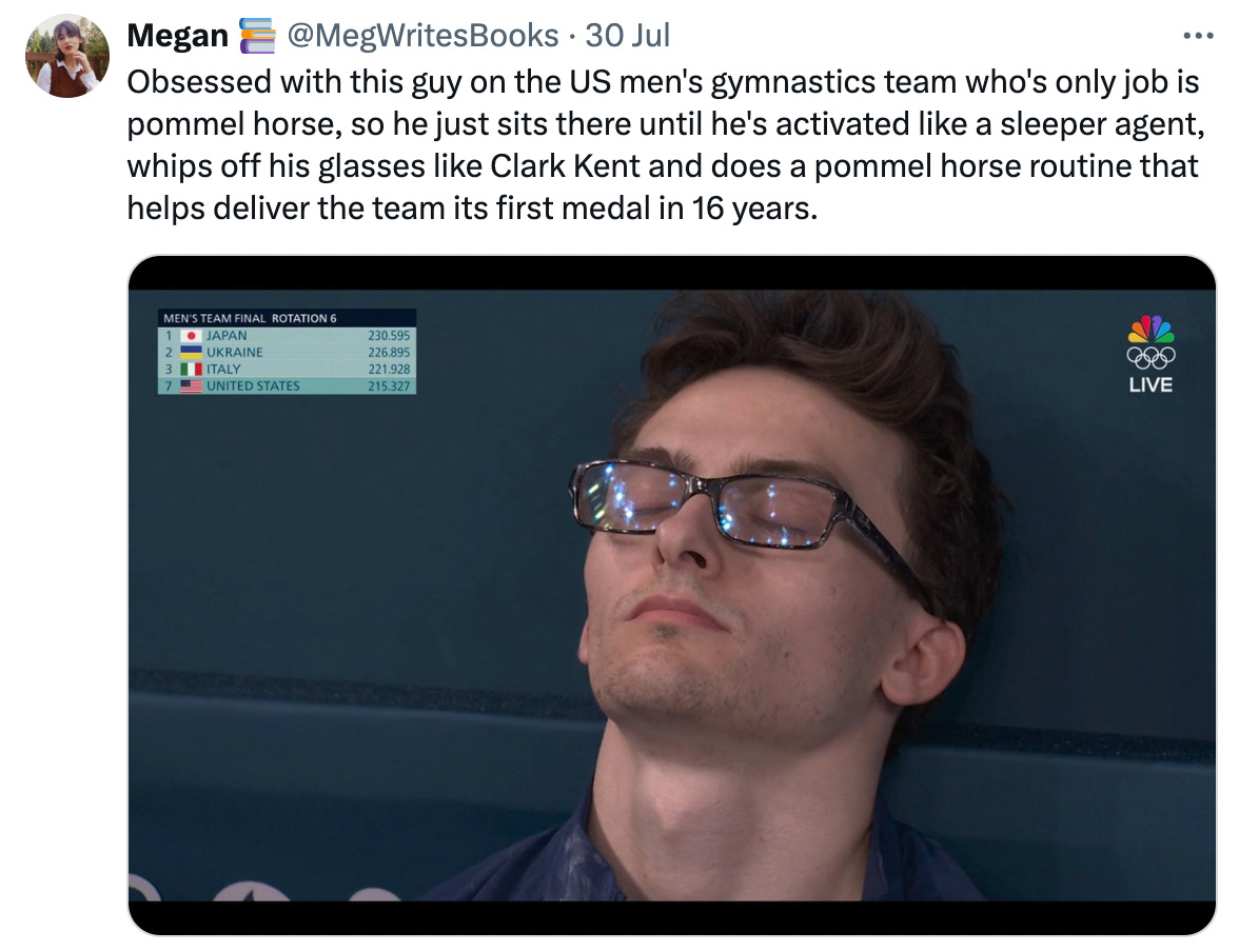 The Men’s Gymnastics team from America included an athlete who only specialised in the Pommel Horse bit of the routine. He seemed to be asleep and stoic while his teammates did their thing, only to take off his glasses and crush his performance when it was his turn, leading the team to win their first even Gold! And now the Internet is in love with the nerdy-looking ‘pommel horse guy’, Stephen Nedoroscik.