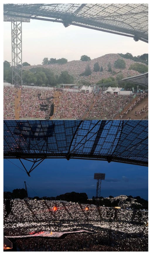 Taylor Swift’s Eras Tour shows in Munich were attended by 75,000 fans in the stadium and an ADDITIONAL 50,000 outside on the hillside which surrounds the venue. While the spectators on the greens couldn’t see the show, they still joined in to listen on both nights and made for quite a sight, especially when everyone held up their phone lights during Swift’s performance of Marjorie.