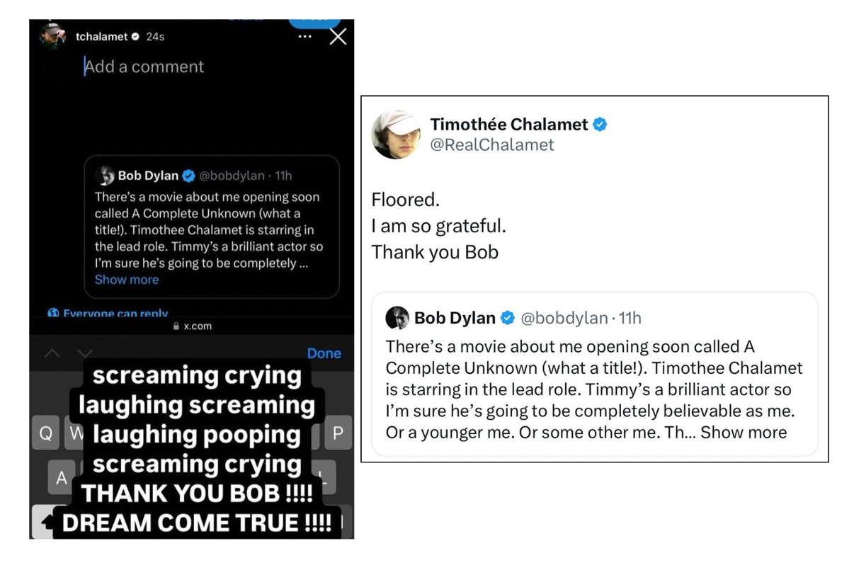Timothee Chalamet's Instagram vs. Twitter reaction to Bob Dylan's tweet about A Complete Unknown, where Chalament plays him, is representative of every fanboy/girl.