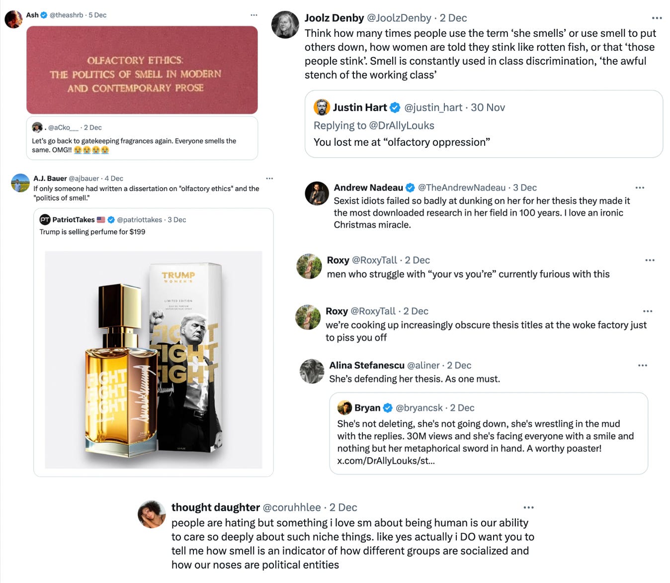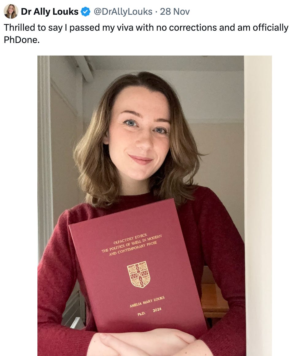 After the topic of her thesis in the picture, Olfactory Ethics: The Politics of Smell in Modern and Contemporary Prose, caught people’s eye, many promptly provided their uninformed opinions, as netizens usually do, questioning the need for her research and niche; while others, in support, provided real-life applications of why her topic was important and more prevalent than one would imagine. The outcome of all this though, was the original tweet getting 117.5 MILLION (and counting) views and Dr Louk’s research being the most downloaded and read in her field in the last 100 years!