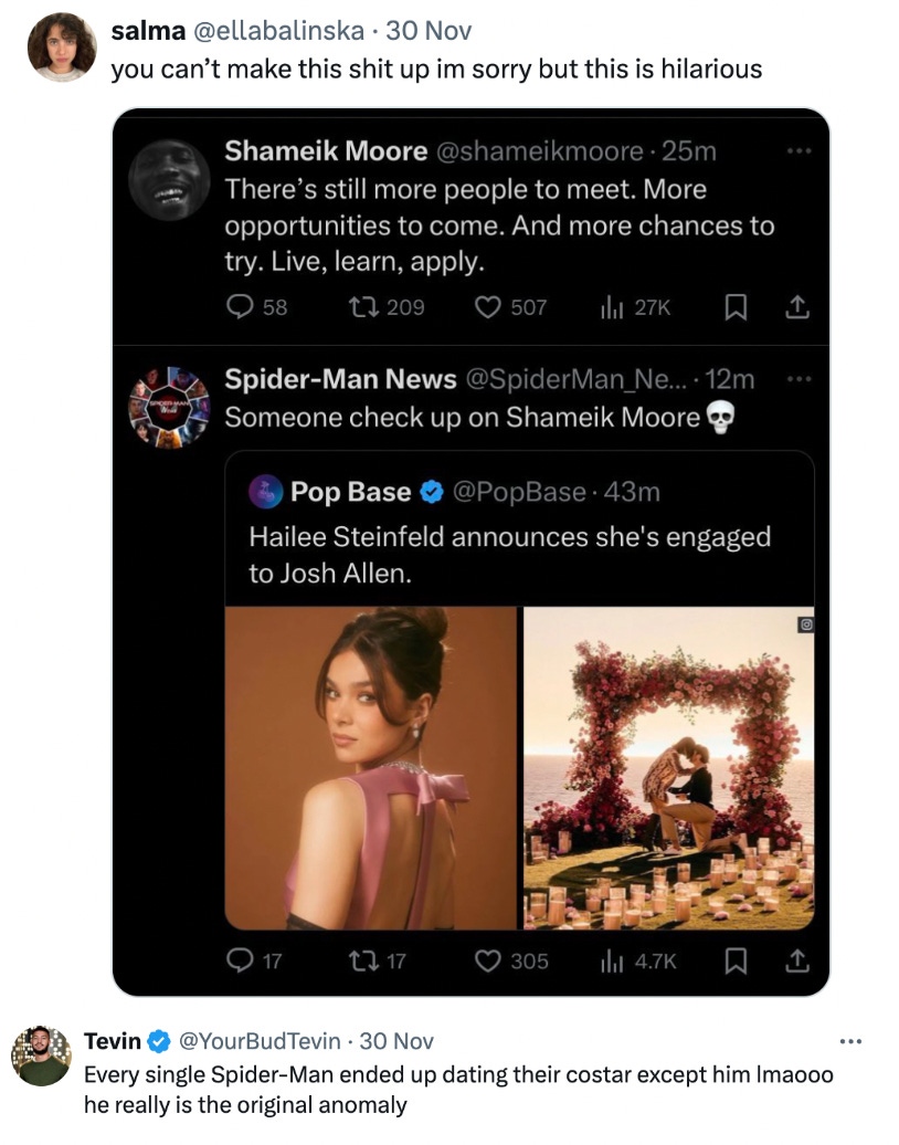 Actress-Singer Hailee Steinfeld got engaged and her Into The Spider-Verse co-star Shameik Moore, who plays the alternate universe Spider-Man Miles Morales, coincidentally tweeted at the same time, making everyone wonder if he’s alluding to the news since he has been trying to shoot his shot with her, repeatedly.