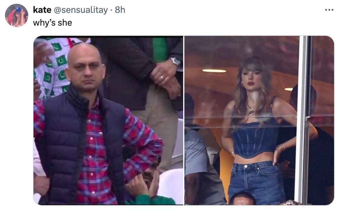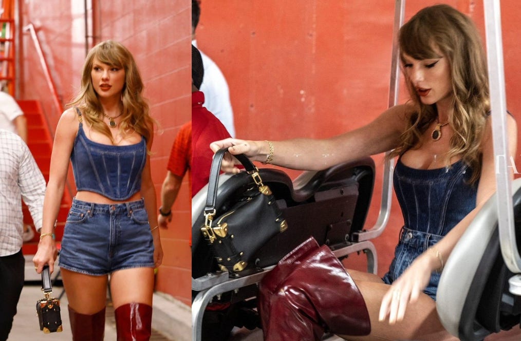 Taylor Swift looked gorgeous attending the Kansas City Chiefs season-opening game against the Baltimore Ravens (the Chiefs won), supporting boyfriend Travis Kelce, wearing a Versace denim corset top, Giuseppe Zanotti boots and a Louis Vuitton box bag.