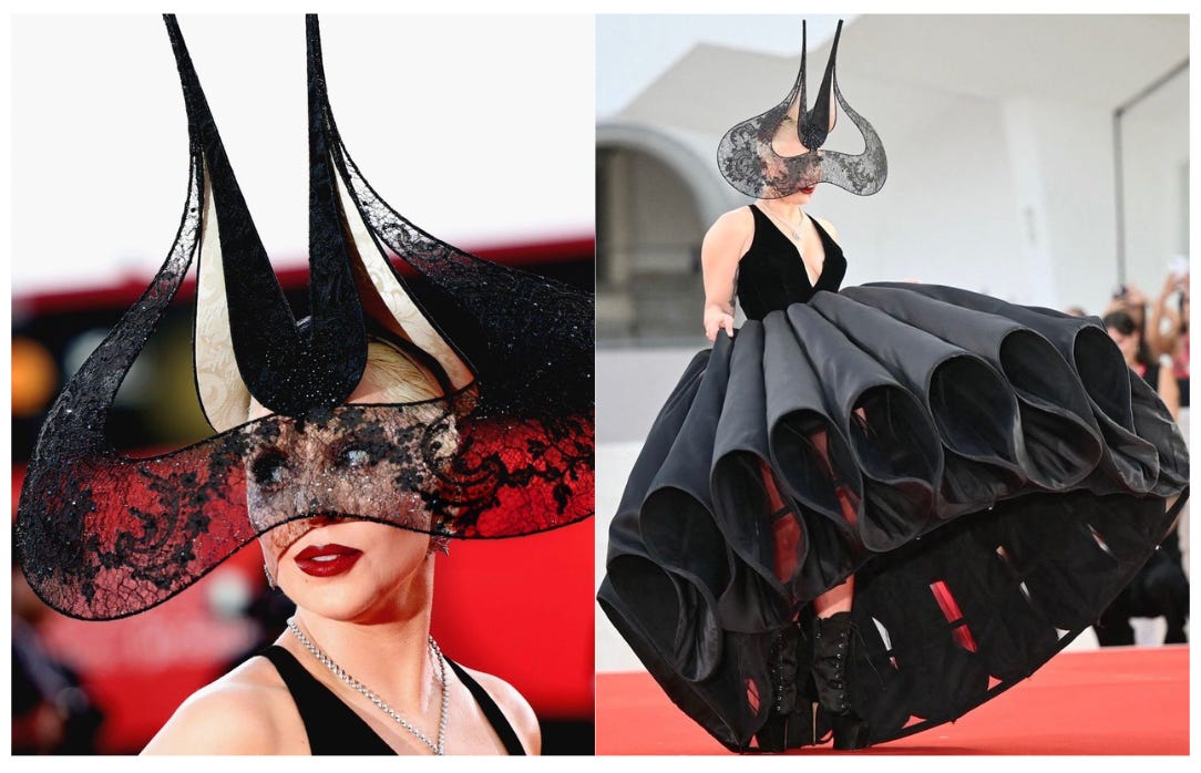 Lady Gaga stunned in a black gown at the Joker: Folie a Deux premiere at the Venice Film Festival. The Christian Dior couture piece comprised a corset with a criss-cross back and a tiered statement skirt. But what stole the show was a pointed, lace mask/headpiece by Philip Treacy, reminiscent of the bat ears of the iconic Batman mask, complimenting the movie she is in. After all, she does live for the applause.
