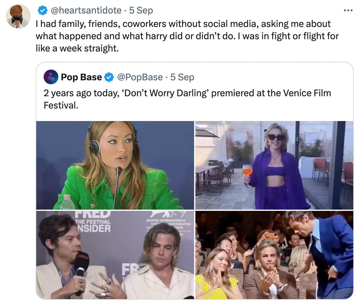 Speaking of the Venice Film Festival, 2 years ago this week, the infamous Don’t Worry Darling premiere took place. Florence “Miss Flo” Pugh ditched the press conference, the cast refused to interact with director Olivia Wilde, Harry Styles “spat” on Chris Pine, and gave us the iconic line- “you know my favourite thing about the movie is like it feels like a movie”. Ahh, good times.