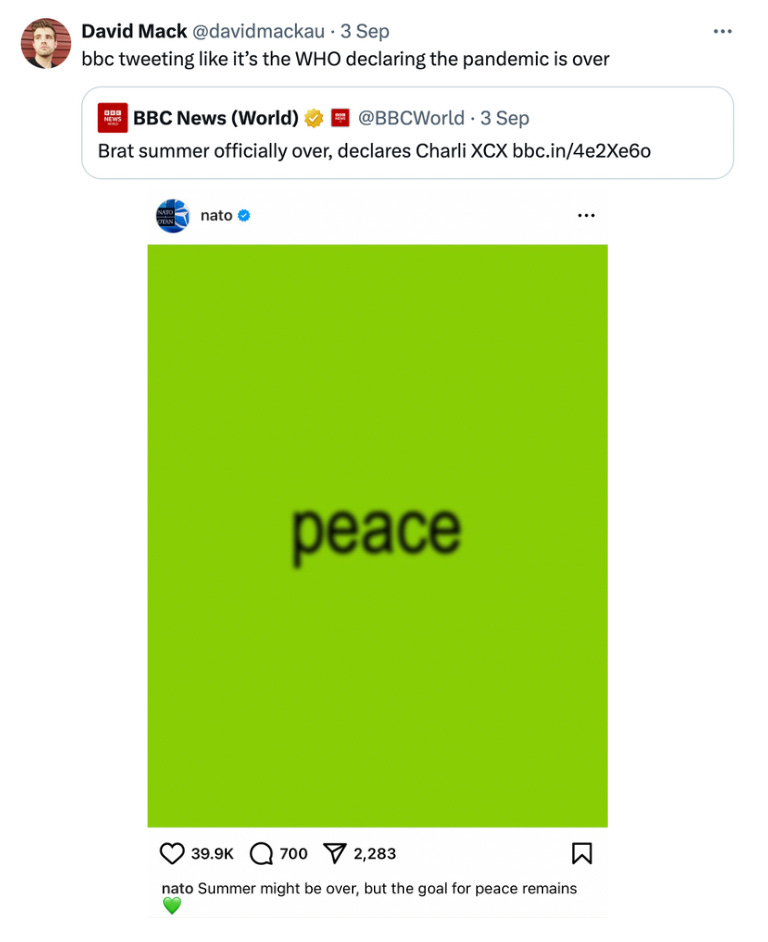 Charli xcx has declared that brat summer is officially over. And NATO and the BBC joined in?