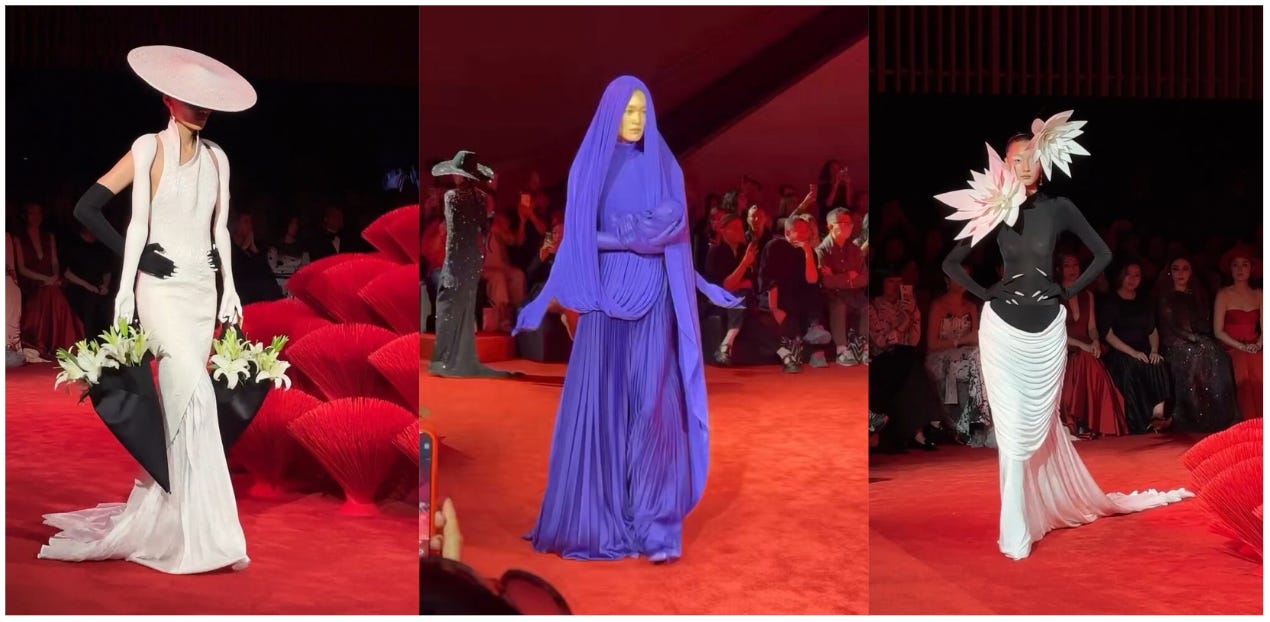 Robert Wun celebrated his 10th anniversary with a runway show in Hong Kong. The collection referenced his childhood, family, and his culture. Multi-arm silhouettes were a nod to the Goddess of Mercy, Guan Yin, while a deep blue dress featuring a cradled baby was a touching tribute to his late grandmother.