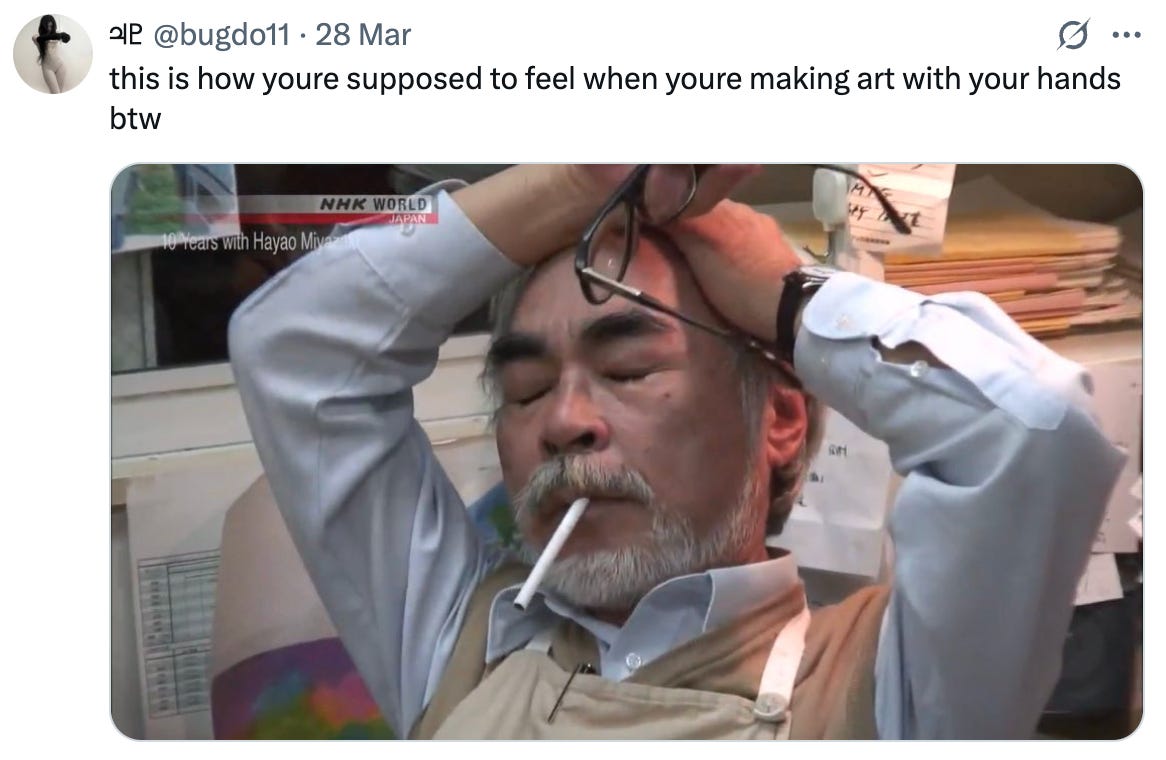 OpenAI has launched a new image generating feature to ChatGPT to replicate Hayao Miyazaki’s Studio Ghibli style of art, and I can’t express enough how deeply sad and angry it makes me. As a long-time fan of Studio Ghibli and their distinct animation style, I need you to know how painstakingly each frame of those movies is made. They are completely hand drawn animated films. Human artists are the reason why this style looks as beautiful as it does. And it comes from a place of love and passion, not a burden that needs to be delegated to technology as soon as its possible. Founder Hayao Miyazaki in 2016 expressed his distaste towards AI art calling it “an awful insult to life”, and I agree with him. Turning your photos into a cartoon version is not art, it’s not cute or fun and nor is it somehow making art accessible. What it is, is wasting the planet’s water (yes, that’s how your AI requests are powered), a form of technological piracy and a shift towards a deeply empty life chasing aesthetics instead of appreciating and placing value in art.