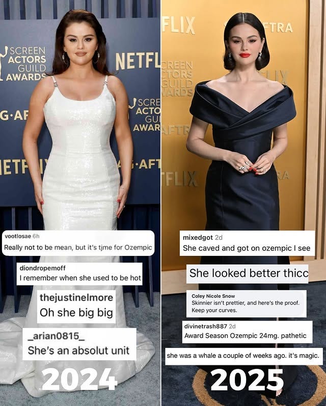 Another person in the spotlight was Selena Gomez, dressed by Celine (they also dressed Kendrick Lamar for the Super Bowl, talk about having a moment!) in an off shoulder black gown, and short hair in a bob that many likened to Snow White. However, people were quick to highlight the reactions compared to last year, when Gomez was going through weight fluctuations due to lupus.
