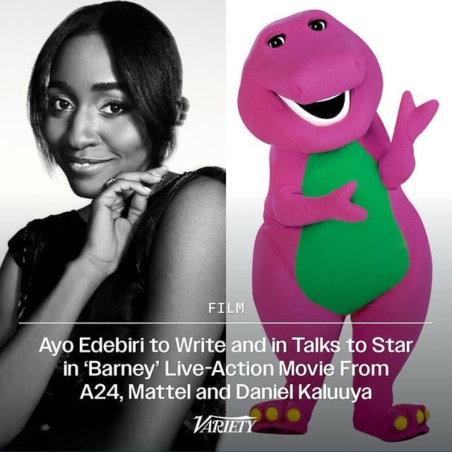 Ayo Edebiri is set to write, and potentially star in a live-action Barney movie by A24, Mattel and Daniel Kaluuya. Curious to see what a live-action of an already live-action purple dinosaur looks like…