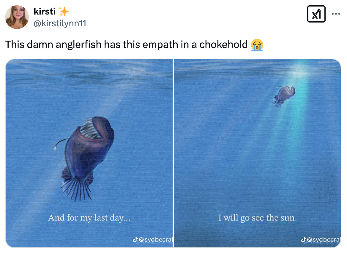 A video of an Anglerfish is going viral. This six-inch fish usually found in deep water is seen uncharacteristically swimming towards the surface. This fish are known for creating their own bioluminescent light so many are speculating it was swimming towards the sunlight as it didn’t have light of its own. The video is now being used as background for inspirational and emotional quotes.
