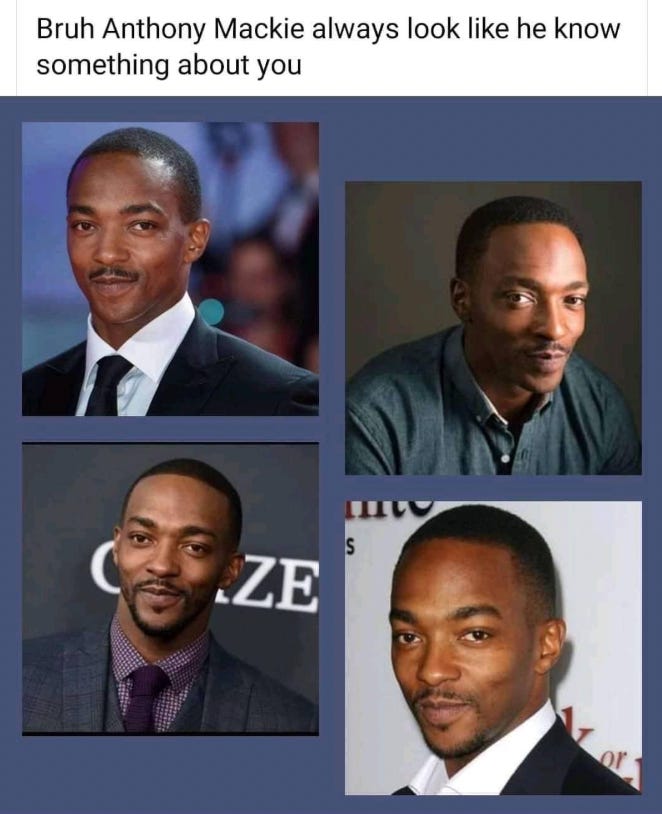 Anthony Mackie DOES always look like he knows something you don’t. The new Captain America’s signature smize is being endlessly memed for looking like he’s trying to hold in a laugh/say a bad pun/reveal your secrets.