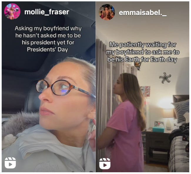 Short form videos about “waiting for my boyfriend to ask me to be his ____ for ____ Day” are all over after Valentine’s Day, when despite being in a relationship girlfriends still expect to be asked to be their partner’s valentine.